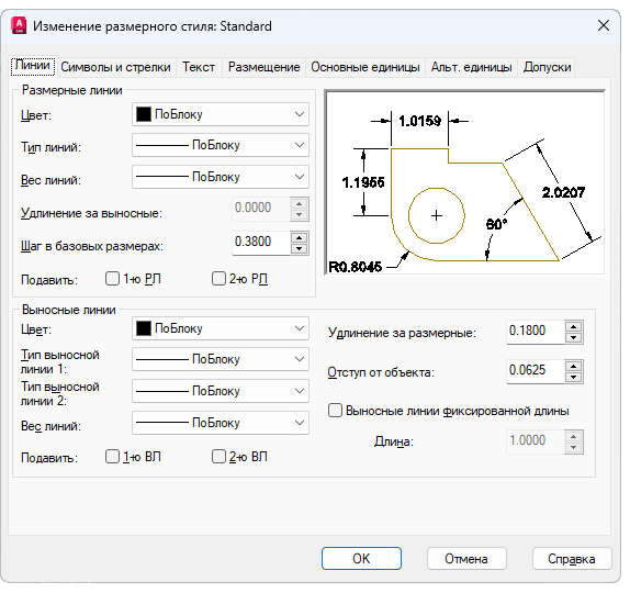С помощью размерных стилей можно задать и обеспечить соблюдение стандартов черчения. Доступно множество размерных переменных, которые можно задать с помощью команды РЗМСТИЛЬ, позволяющей управлять практически всеми нюансами отображения и поведения размеров. Все эти параметры хранятся в каждом из размерных стилей.