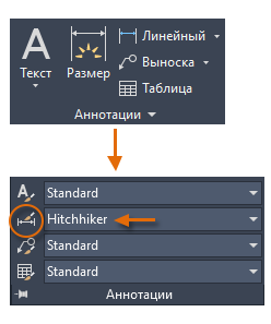 Имя текущего размерного стиля (в данном случае "Hitchhiker") отображается в раскрывающемся списке панели "Аннотация".