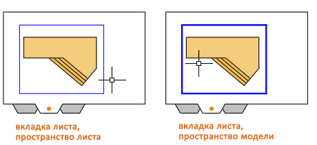 При работе на вкладке листа можно переключаться между пространством листа и пространством модели без возврата на вкладку «Модель». Вот как это делается. Переместите курсор, как показано на рисунке, и дважды щелкните внутри видового экрана листа, чтобы перейти в пространство модели, или за пределами видового экрана листа, чтобы вернуться в пространство листа. При работе в пространстве модели границы видового экрана листа становятся толще.