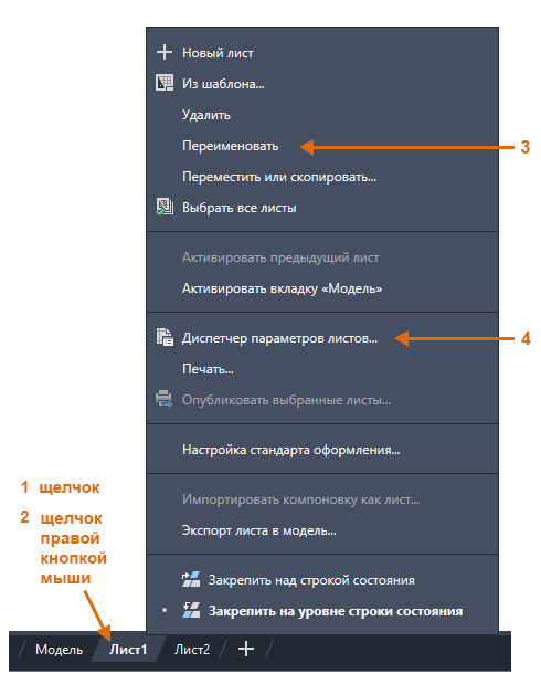 При открытии вкладки листа (1) в первую очередь нужно щелкнуть по ней правой кнопкой мыши (2) и изменить ее имя (3) на что-то более конкретное, чем "Лист 1". Рекомендуется выбирать имена, которые ссылаются на конкретный размер стандартов ANSI или ISO.