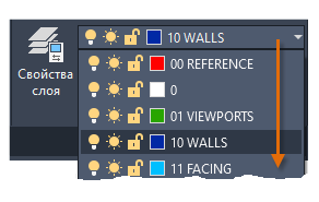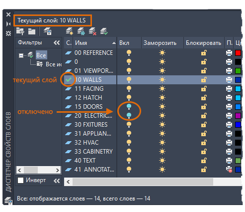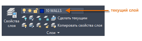 Как показано на рисунке, слой 10 «СТЕНЫ» является текущим. Все новые объекты автоматически размещаются на этом слое. В списке слоев зеленая отметка рядом со слоем 10 "СТЕНЫ" подтверждает использование этого слоя в качестве текущего.