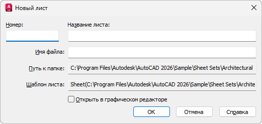 Создание нового листа в текущей подшивке. При этом создается новый файл чертежа (DWG), включающий в себя вкладку-лист с тем же именем, что и сам чертеж.