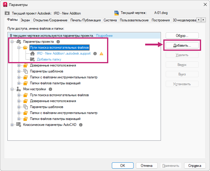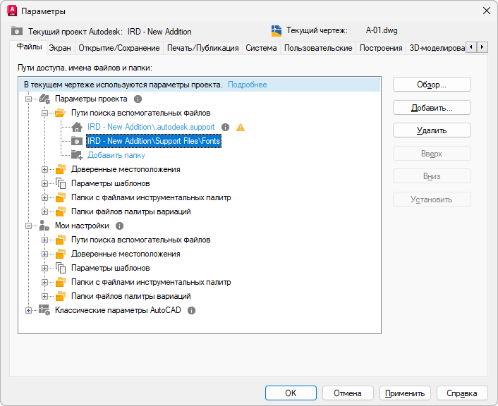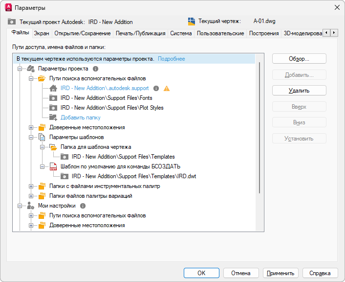 После настройки проекта Autodesk Docs на использование подключенных вспомогательных файлов можно настроить или изменить параметры путей. Поиск путей выполняется в порядке их перечисления. Если один и тот же файл найден в нескольких папках, то используется первый найденный экземпляр. Настройки в разделе «Параметры проекта» имеют приоритет над разделами «Мои настройки» и «Классические настройки AutoCAD».