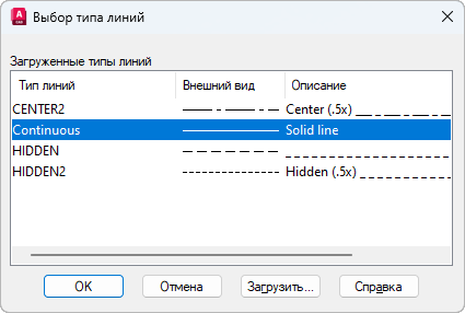 Диалоговое окно "Выбор типа линий" (диспетчер свойств слоев)