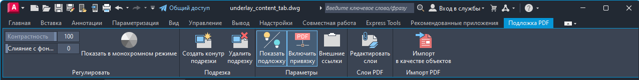 При выборе подложки PDF контекстная вкладка "PDF" отображается на ленте.