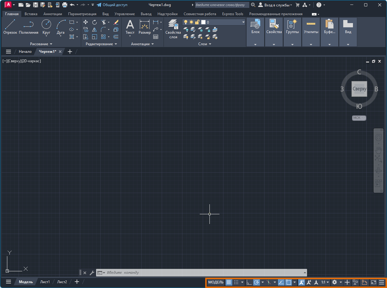 В строке состояния отображается положение курсора, инструменты чертежа, а также инструменты, которые влияют на среду чертежа.