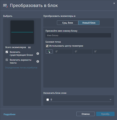 Можно преобразовать исходный объект или выбранные экземпляры в новый блок. В диалоговом окне «Преобразовать» укажите имя блока и точку вставки, чтобы задать новый блок. По умолчанию точка вставки устанавливается в центре выбранного геометрического объекта.