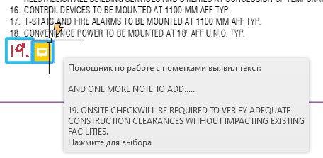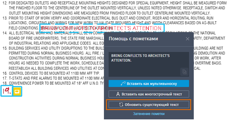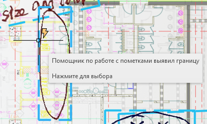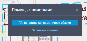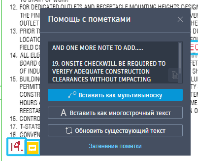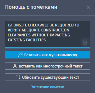 Функция «Помощь с пометками» предназначена для взаимодействия с импортированными пометками. Функция распознает обычный и перечеркнутый текст, выноски, пометочные облака, текстовые инструкции и комментарии PDF. При работе с пометкой, например при вставке пометочного облака или многострочного текста, объект добавляется в чертеж, а не в трассировку.