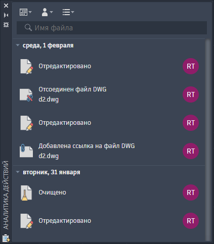 Аналитика действий позволяет отслеживать события каждый раз, когда кто-либо открывает файл чертежа или работает с ним в AutoCAD. Кроме того, с ее помощью можно отслеживать некоторые события за пределами AutoCAD, например переименование или копирование чертежа в Проводнике Windows. При открытии чертежа произошедшие с ним события считываются из базы данных функции «Аналитика действий» и отображаются в хронологическом порядке на одноименной палитре. В процессе работы с чертежом события записываются в базу данных, что обеспечивает актуальность содержимого палитры.