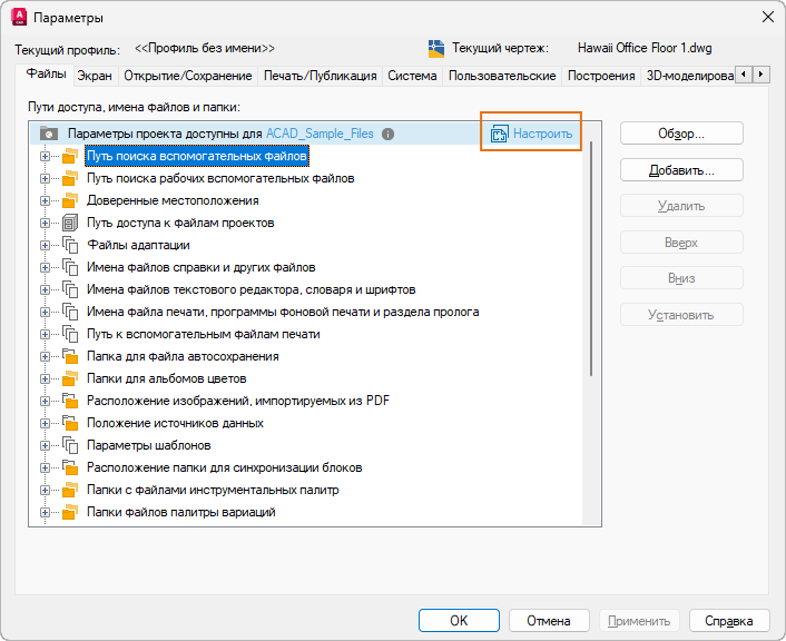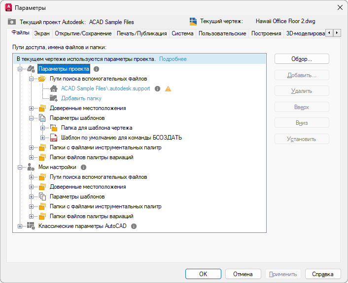 В процессе настройки вспомогательных файлов для проекта Autodesk Docs программа AutoCAD создает папку с именем .autodesk.support. AutoCAD начинает поиск необходимых вспомогательных файлов с папки .autodesk.support (и ее вложенных папок) в проекте Autodesk Docs. Этот процесс можно расширить путем добавления других папок вспомогательных файлов в нескольких проектах. При необходимости также можно добавить пользовательские папки и параметры.