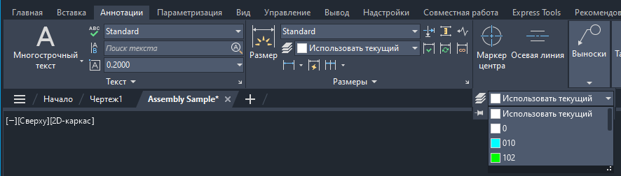 - На ленте, выбрав вкладку «Аннотации» > панель «Осевые линии» > элемент управления «Слой».