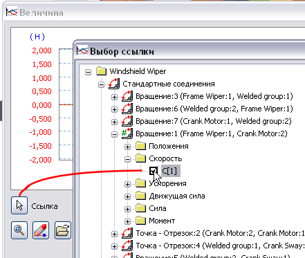 В диалоговом окне "Выбор ссылки" раскройте группу "Стандартные соединения" > "Призматические (Направляющая:1, Шотландский хомут:1)", чтобы открыть папку скоростей. Нажмите V(1), чтобы задать скорость как переменную для оси X графика.