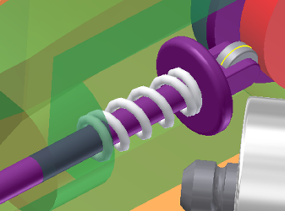 Выталкиватель предназначен для скольжения через часть компонента "Направляющая". Однако для удержания ролика выталкивателя вплотную к кулачку между компонентами "Выталкиватель" и "Направляющая" необходимо создать пружину. В среде динамического моделирования для этого имеется соответствующее соединение "Пружина / Амортизатор / Домкрат".