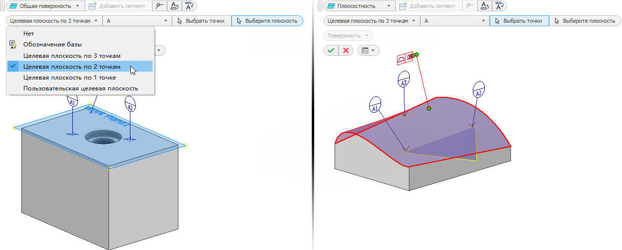 Можно создать обозначение участка базы, выбрав один из параметров в раскрывающемся списке. Например, на следующем изображении слева показано создание участка базы с помощью двух точек 2D-эскиза и рабочей плоскости. На изображении справа используются три рабочие точки и рабочая плоскость.