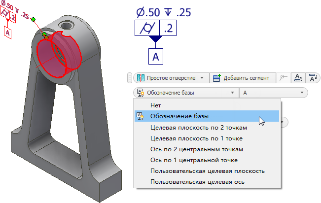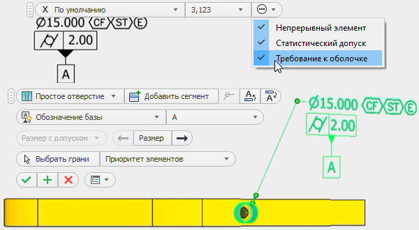 На мини-панели инструментов доступен интерактивный предварительный просмотр аннотаций допуска. На мини-панели инструментов доступны команды, с помощью которых можно выбрать тип геометрии или элемента, добавить обозначение базы или дополнительную строку в допуск формы. Параметры, соответствующие выбранной геометрии или элементу, отображаются в списках.