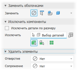 Исключение компонентов: доступ к функциям выбора компонентов, которые следует включить в упрощенную деталь или исключить из нее. Выберите отдельные компоненты или все вхождения компонента.