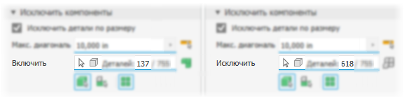 Исключение деталей посредством выбора (по умолчанию). Параметр «Исключить детали с учетом размера» отключен, а инструмент выбора «Исключить» активен.