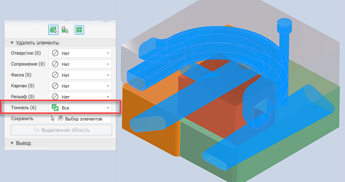 Элемент Туннель распознает набор граней, содержащихся внутри модели и определяющих открытую область, которая имеет один или несколько входов в область с наружных граней.