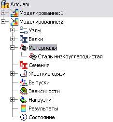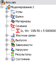 . Производится автоматическое упрощение сборки до уровня расчетной модели балки. В графическом окне отображаются балки, узлы и значки центра тяжести. В папке "Статус" отображаются неподходящие материалы и некорректные сечения балок.