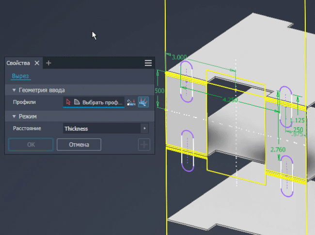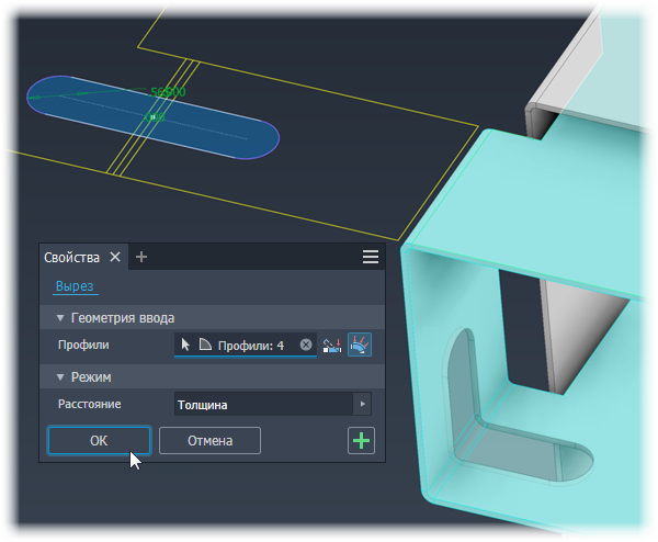 Вырез на сгибе. Вырез выдавливается на заданное расстояние, по умолчанию равное значению параметра «Толщина», и накладывается на сгибы перпендикулярно соответствующим граням с сохранением параметров геометрии эскиза. В развертке вырез соответствует профилю эскиза.
