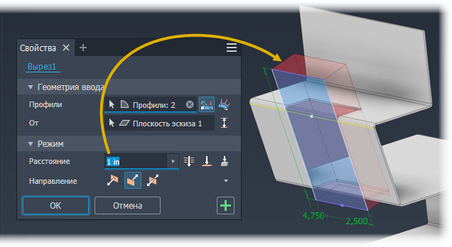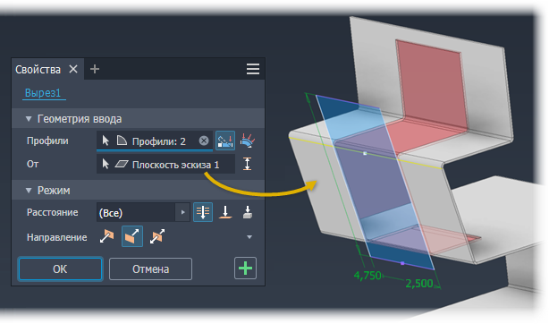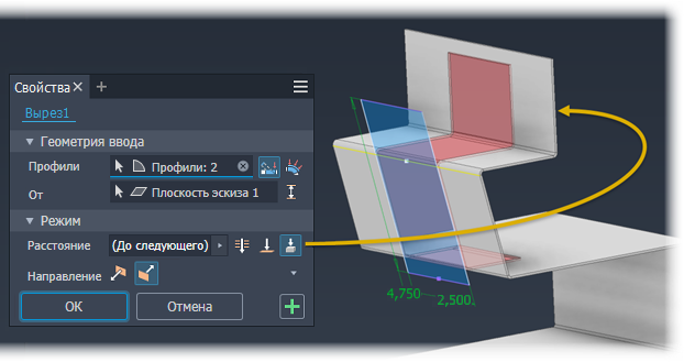 Расстояние. Задание глубины выреза. Метод по умолчанию создает вырез перпендикулярно плоскости эскиза. Справа от поля «Расстояние» выберите метод, который требуется использовать для определения расстояния. Результат выреза отображается красным цветом.