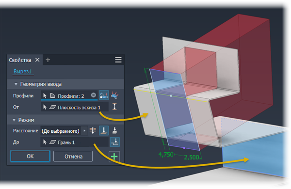 До — выдавливание профиля выреза до выбранной грани или рабочей плоскости. (Можно завершить вырез на грани, которая выходит за пределы конечной плоскости.) В сборке грань или плоскость могут принадлежать другой детали. Укажите, требуется ли, чтобы вырез выходил за пределы выбранной грани.