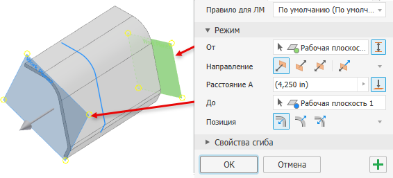 В группе «Свойства сгиба» укажите радиус сгиба и правило развертки для использования.