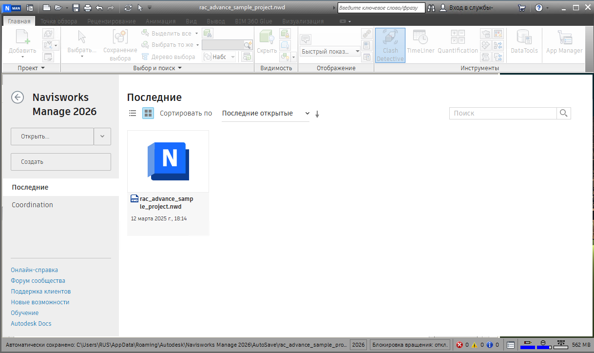 Главная страница Navisworks отображается при запуске программы. К ней можно вернуться в любое время, щелкнув