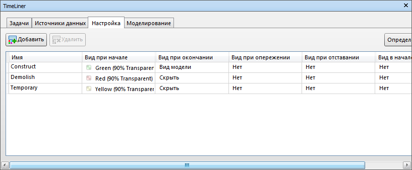 или щелкните правой кнопкой мыши область задач и создайте исходный набор задач на основе имен слоев, элементов или наборов объектов. В модуле "Шкала времени" определены несколько стандартных типов задач ("Создание", "Разрушение" и "Временное"), а пользователь может определить собственные типы задач, используя вкладку "Настройка". В диаграммах Гантта можно просмотреть графическое представление расписания проекта в режиме только для чтения, а также переключать отображение дат с атрибутами "Запланировано", "Фактически" и "Запланировано — фактически".