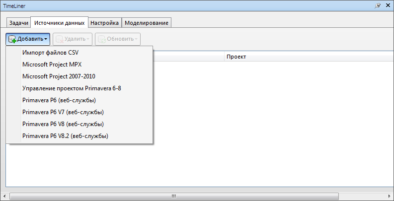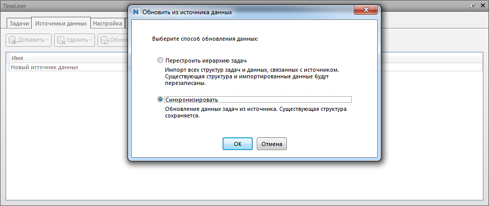 Можно использовать вкладку "Источники данных" для импорта задач из внешнего источника, например из Microsoft Project™. Для определения типов импортируемых задач можно выбирать поле из внешнего плана-графика, а можно задавать типы задач вручную. Параметры задач можно редактировать непосредственно в окне "Шкала времени". Можно также обновить план-график извне и обновить задачи в "Шкале времени", чтобы привести их в соответствие с данными из внешнего источника. Все изменения, внесенные в задачи, импортированные из внешних файлов проекта, будут перезаписаны при следующем обновлении соответствующих источников данных.