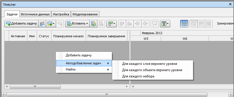 При использовании функции автодобавления задач на вкладке "Задачи" для создания исходного набора на основе имен слоев, элементов или наборов объектов соответствующие слои, элементы и наборы объектов уже будут присоединены.