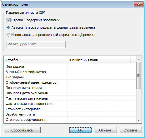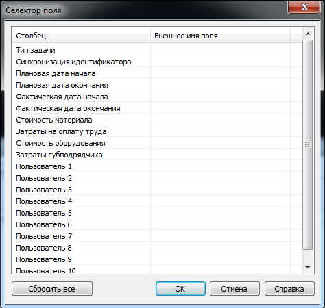В диалоговое окно "Селектор поля" определяются различные параметры, используемые при импорте данных из плана-графика внешнего проекта.