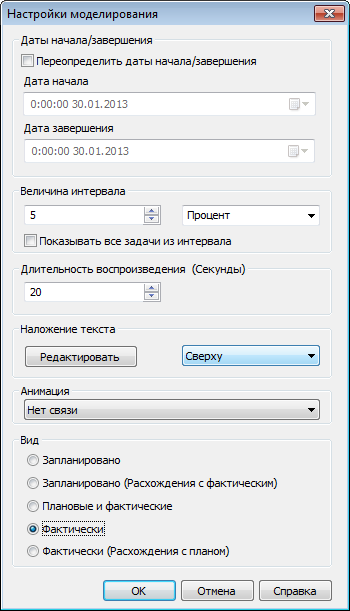 Можно переопределить даты начала и завершения, в пределах которых выполняется моделирование. Установка флажка "Переопределить даты начала/завершения" приводит к активации полей дат и позволяет выбрать даты начала и завершения. Это дает возможность выполнить моделирование не целого проекта, а небольшого его раздела. Даты будут отображаться на вкладке "Моделирование". Кроме того, эти даты будут использоваться при экспорте анимаций.