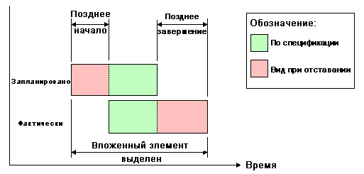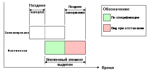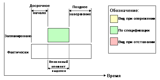 Запланировано — фактически. Выберите этот вид для моделирования расхождений фактического плана-графика с планируемым. Выделяются объекты, присоединенные к задаче, определяемой и планируемыми, и фактическими датами (т. е. укладывающейся в период между самыми ранними датами фактического и планируемого начала и самыми поздними датами фактического и планируемого завершения. (На представленных ниже схемах все это представлено в графическом виде). Для периодов времени, при которых даты фактических событий попадают в интервал дат планируемых событий (по плану-графику), объекты, присоединенные к задаче, будут отображаться с настройками "Вид при начале" для данного типа задачи. В случае если фактические даты оказываются более ранними или более поздними по сравнению с планируемыми датами (имеется расхождение), объекты, присоединенные к задаче, будут отображаться в соответствии с настройкой параметра "Тип задачи", "Вид при опережении" или "Вид при отставании".