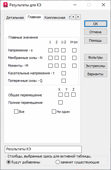 Если выбрать s1, s2 или s12, в таблице появятся колонки для значений напряжения s1, s2 или s12 соответственно, для отдельных поверхностных элементов КЭ в общей системе координат, выбранной во время расчета конструкции.