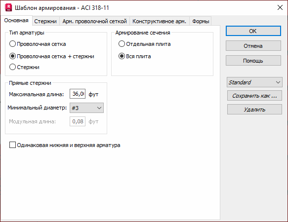 При переходе на вкладку «Основная» в диалоговом окне Шаблоны армирования можно настроить общие параметры, относящиеся к плите.