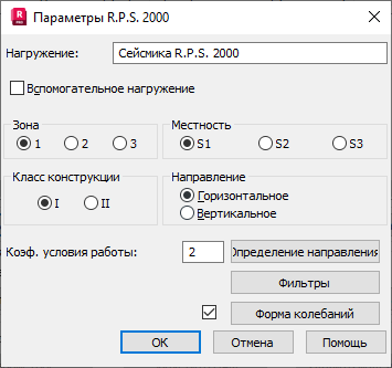 Параметры сейсмического расчета конструкции зависят от выбора сейсмических норм, по которым производится расчет влияния сейсмических нагрузок на конструкцию. После выбора марокканских сейсмических норм RPS 2000 в диалоговом окне Новый вариант нагружения или нажатия на кнопку Параметры в диалоговом окне Тип расчета на экране появляется следующее диалоговое окно.