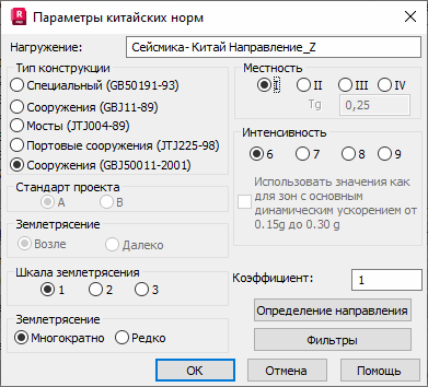 Параметры сейсмического расчета конструкции зависят от выбора сейсмических норм, по которым производится расчет влияния сейсмических нагрузок на конструкцию. Необходимо выбрать Китайские нормы в диалоговом окне Новый вариант или выбрать Параметры в диалоговом окне Тип расчета.