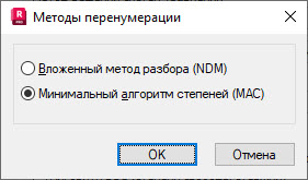 В программе доступны два метода перенумерации: вложенный метод разбора (NDM) и минимальный степенной алгоритм (MDA). Применение обоих методов состоит в редукции при факторизации ненулевых членов матрицы уравнений. Такие методы перенумерации применяются к так называемым разреженным матрицам, которые не имеют ленточной структуры. Поэтому, методы факторизации для таких матриц называются разреженными методами.