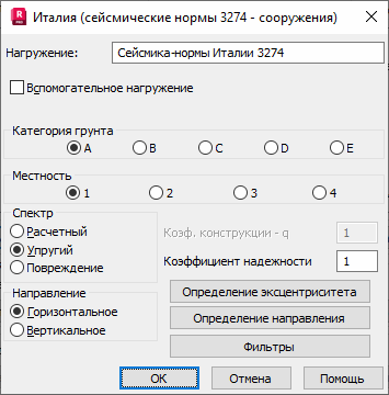 Параметры сейсмического расчета определены сейсмическими нормами, выбранными для использования во время проведения расчета конструкции, подвергающейся сейсмическому воздействию. После того, как итальянские сейсмические нормы (2003) были выбраны в диалоговом окне Создание нового нагружения, или в диалоговом окне Тип расчета была нажата кнопка Параметры (заданный для данных норм вариант сейсмического расчета должен быть выделен подсветкой), на экран появится диалоговое окно, как показано на рисунке ниже.