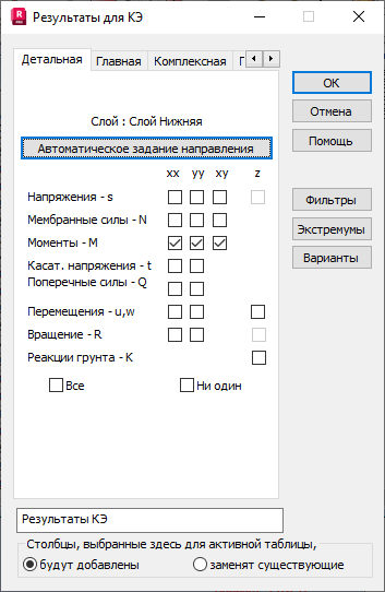 - моменты Mxx, Myy, Mxy; добавляются колонки для значений моментов Mxx, Myy или Mxy, соответственно, для отдельного плоского конечного элемента в местной системе координат, выбранной при расчете конструкции;