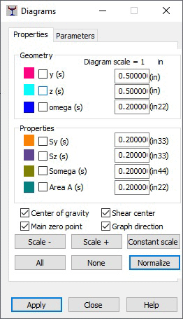 На вкладке "Свойства" в диалоговом окне Графики (тонкостенное сечение) можно выбрать свойства тонкостенного сечения, для которого будут представлены графики.