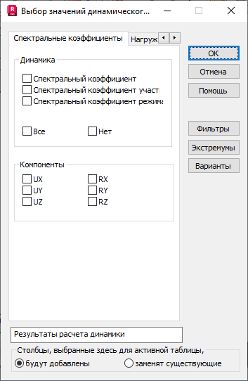 - Компоненты. В зависимости от выбора в диалоговом окне, будут отображаться столбцы, в которых компоненты Ux, Uy, UZ, Rx Ry или Rz будут иметь следующие значения: коэффициент спектрального режима, коэффициент спектрального участия и спектральный коэффициент.