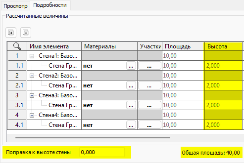 Прим.: Уменьшение высоты стен применяется ко всем выбранным поверхностям стен в помещении.