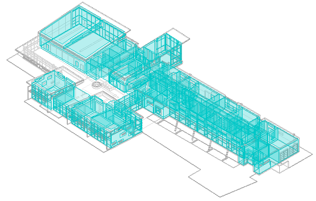 Вид «Аналитические пространства» использует параметры диалогового окна «Видимость/Графика» для скрытия некоторых категорий элементов здания и придания прозрачности со значением 50 % другим категориям модели, таким как перекрытия и крыши. На виде также отображаются аналитические пространства, перекрывающие элементы здания.