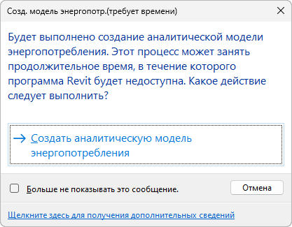 С помощью этого диалогового окна можно избежать случайного запуска процесса создания аналитической модели энергопотребления. Чтобы пропустить это сообщение в будущем, установите соответствующий флажок.