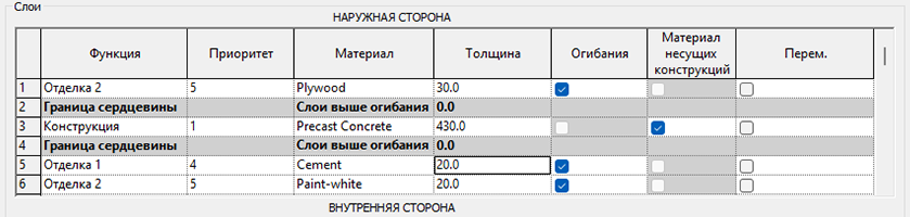 Слой назначается одной строке. Слой стены имеет постоянную толщину. Его высота равна высоте стены. Таблица позволяет изменить толщину слоя. Для изменения толщины следует изменить значение в соответствующей слою строке таблицы. Кроме того, каждому слою можно назначить материал.