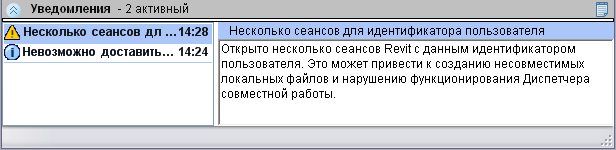 В Worksharing Monitor активное уведомление информирует о существующей проблеме, которая влияет (или может повлиять) на работу в Revit.