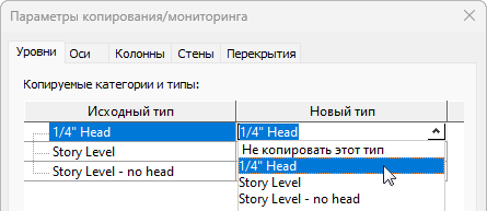 | Запрещение копирования приложением Revit элементов определенного типа. | Найдите тип элементов в столбце Исходный тип. В той же строке в столбце Новый тип выберите Не копировать этот тип. |