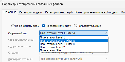 - В диалоговом окне "Параметры отображения связанных файлов" на вкладке "Основные" выполните следующие действия.
